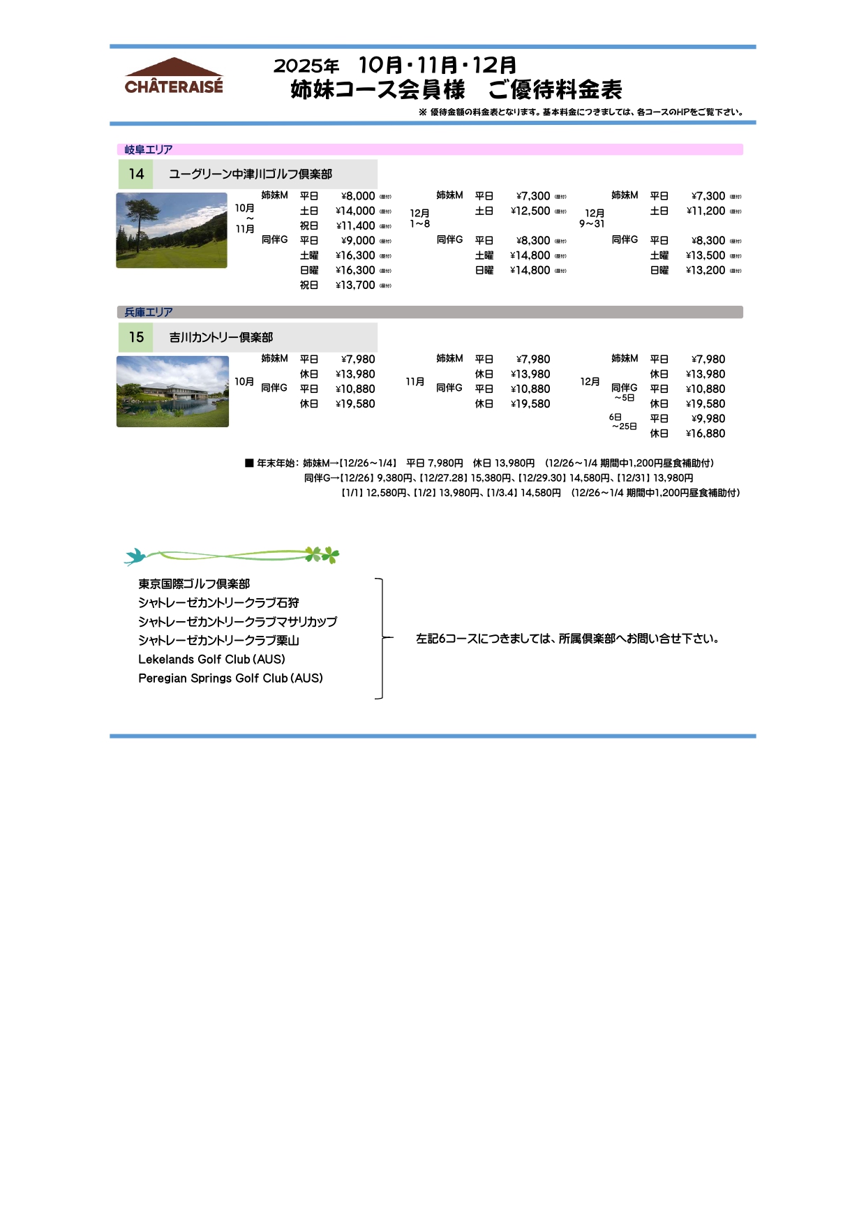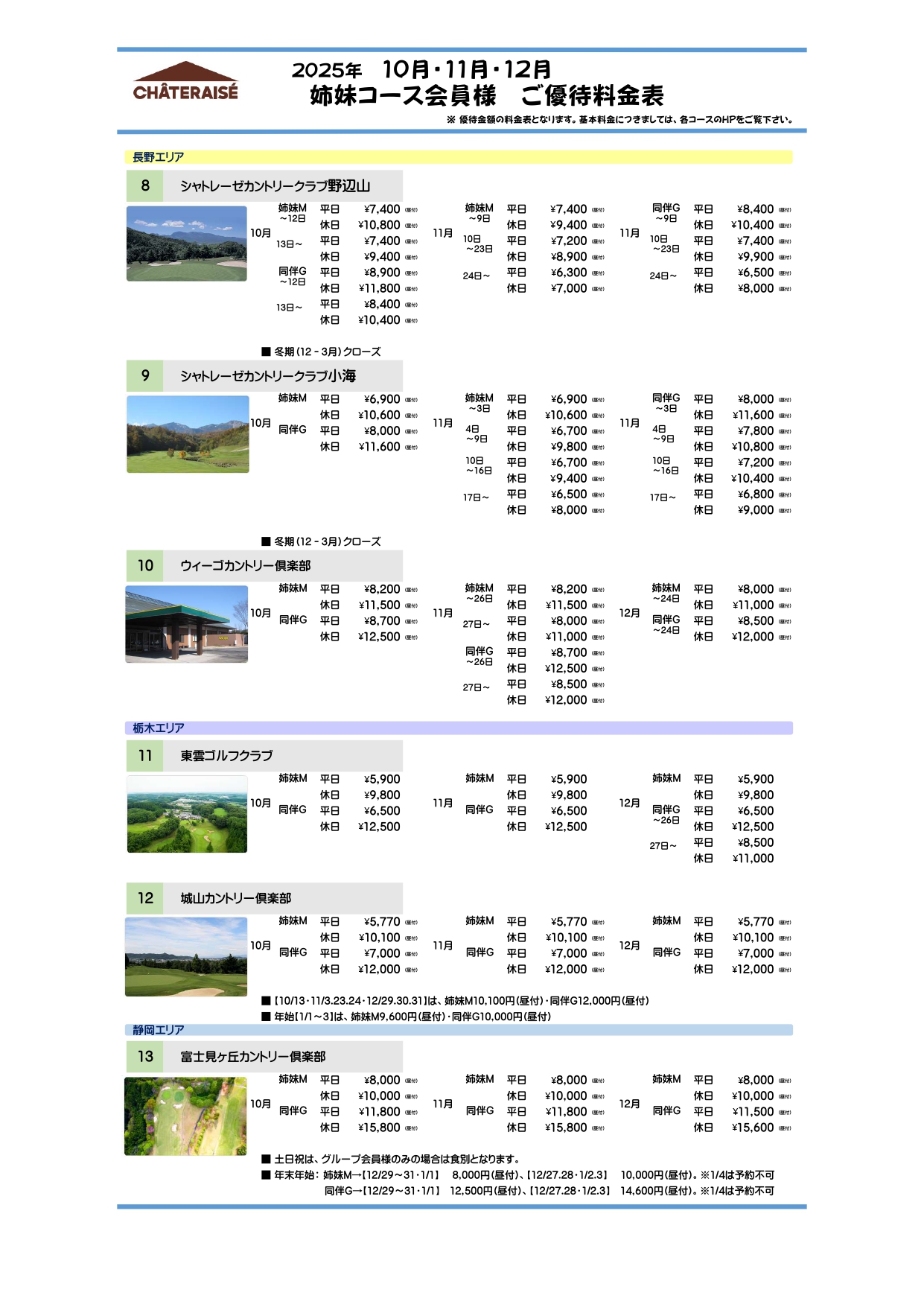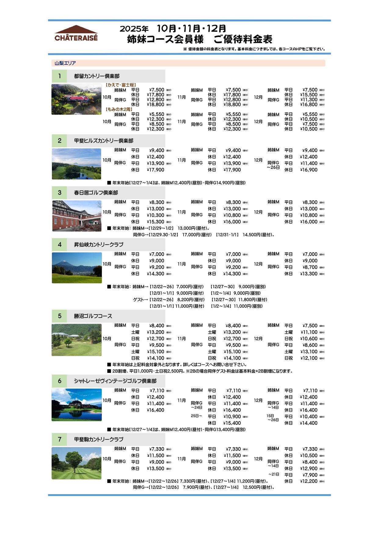 姉妹コース会員様 2025年10月~12月優待料金のご案内