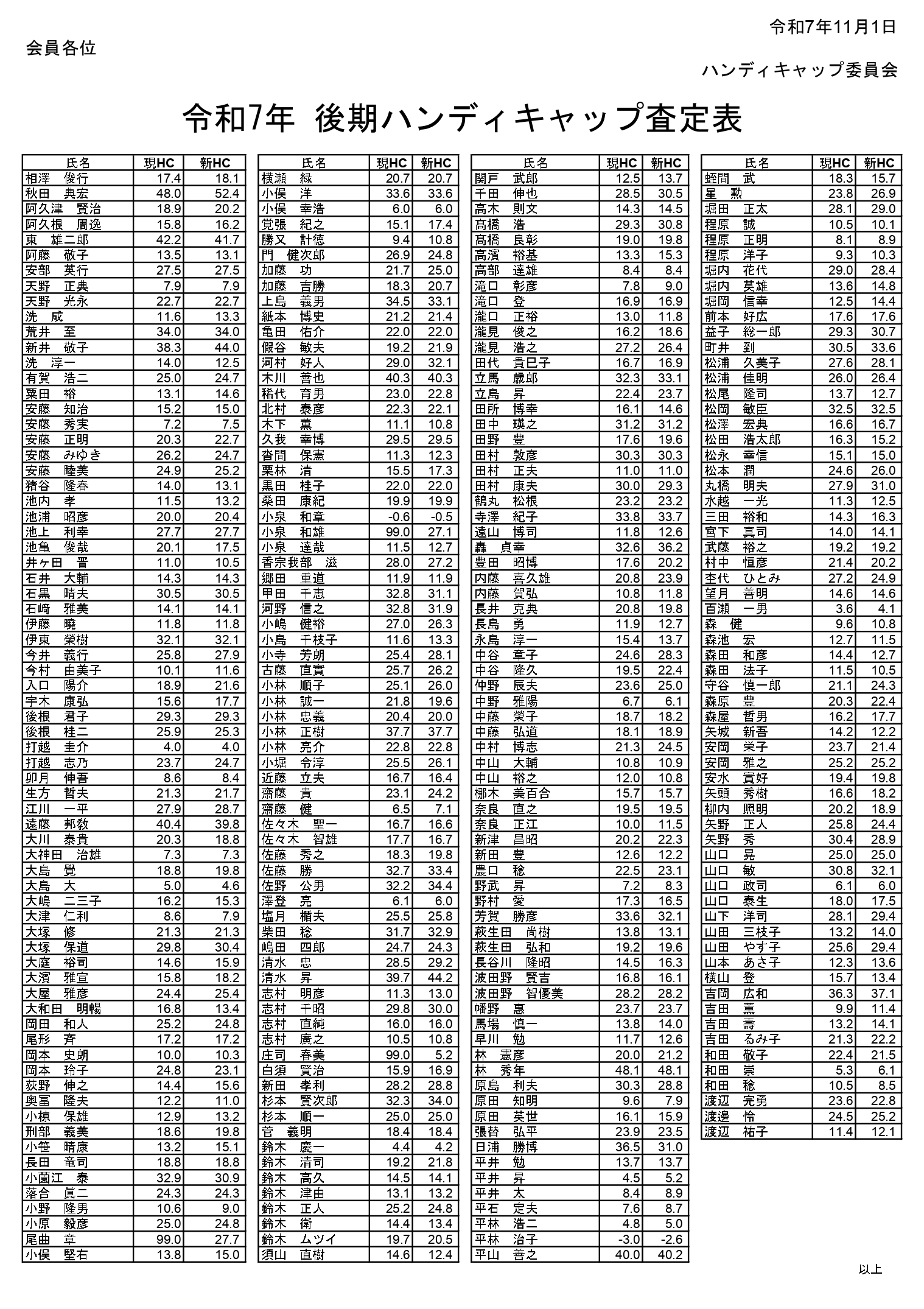 令和7年後期ハンディキャップ査定表