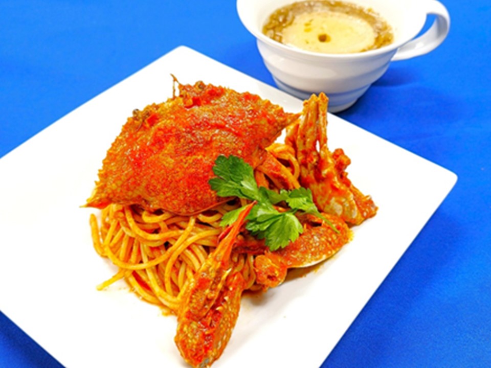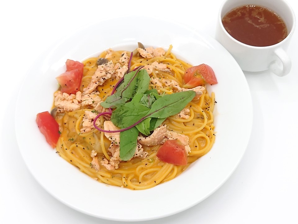 サーモンとキノコのエビ香るクリームパスタ(スープ付)